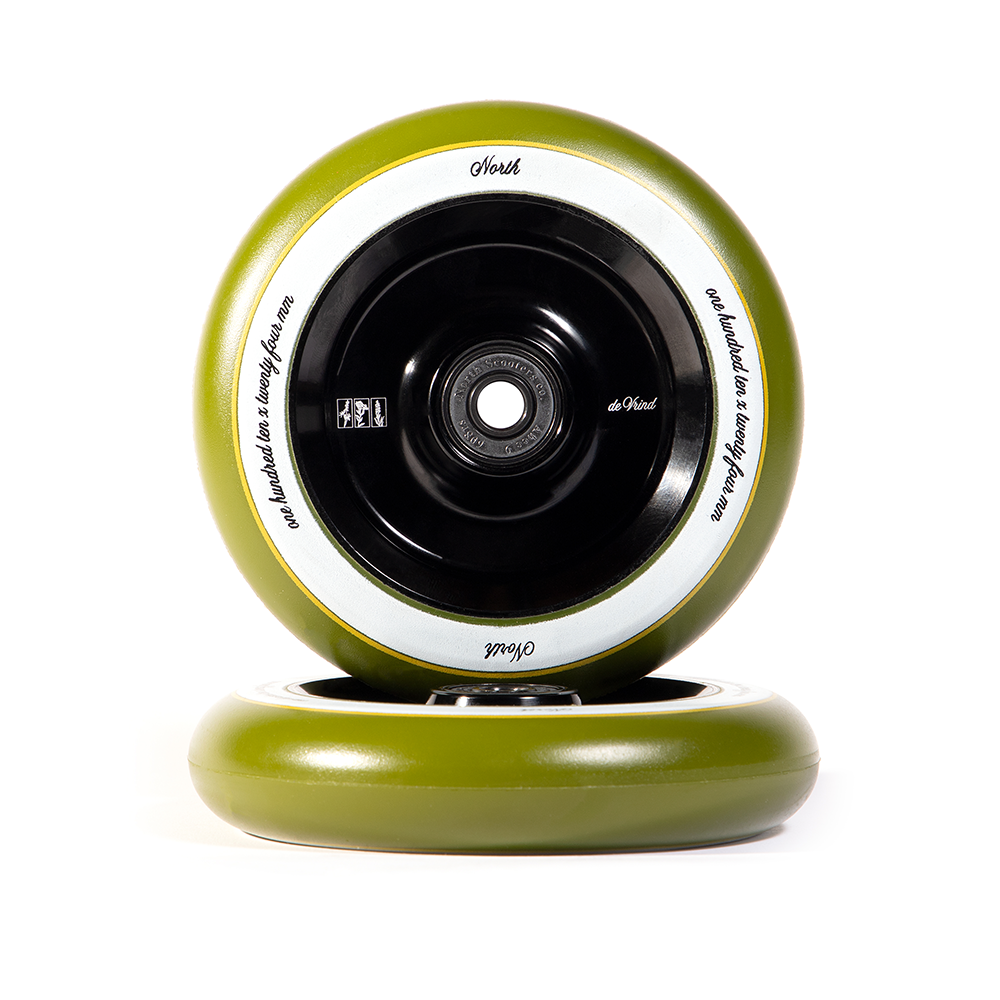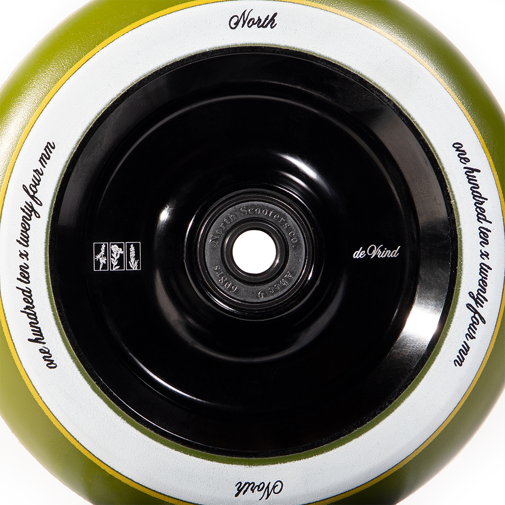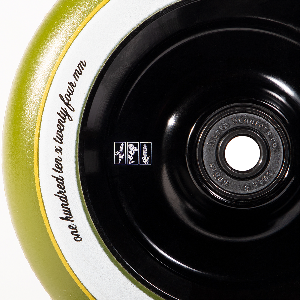 Esta rueda exclusiva utiliza nuestro núcleo Solid Wheel y está disponible en tamaños de 110 x 24 mm y 115 x 30 mm . Incluye nuestros nuevos rodamientos Abec 9 North preinstalados.